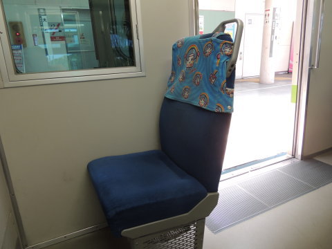 | 「しょもたん」のシートカバー 5000系「第3編成」(グリーンライン)の湘南江の島方先頭車両「5606」(3号車)の座席の一部には、湘南モノレールのマスコットキャラクター「しょもたん」のシートカバーが付けられていました。 2018.06.04現在[大船駅] |