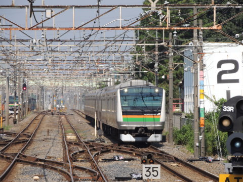 E231系(上り) 上尾駅方面(熊谷・籠原方面)から宮原駅(2番線)に接近中の、E231系(K-14+S-15編成)上野東京ライン「普通 小田原」行(1859E・高崎始発)です。 宮原駅の2番ホーム北端側(上尾・熊谷寄り)にて撮影。 2015.08.22現在 |