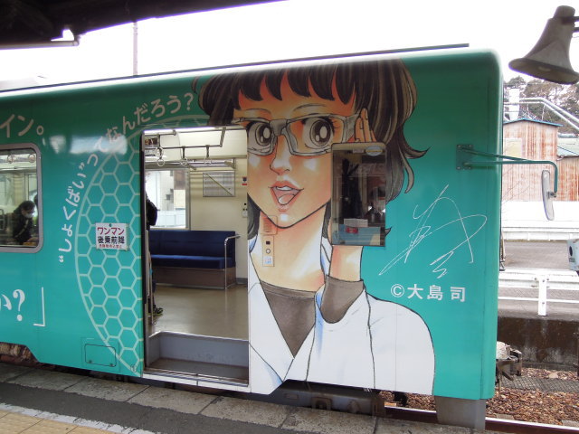 キャタライナーの山側車体側面に描かれたキャラクター (←写真左) 天竜二俣駅(3番線)に停車中の「キャタライナー」の山側車体側面に描かれたキャラクターを撮影したものです。 キャタライナーの山側車体側面には、「化学にふれる、マナビのトレイン。」、「“しょくばい”ってなんだろう?」、「キャタラー好きか?」、「ARK Creation Centre」などと書かれ、漫画家の大島司さんが手がけたキャラクターと同氏のサインなどが描かれています。 2021年12月26日(日)[14:35]現在~天気は雪 |
