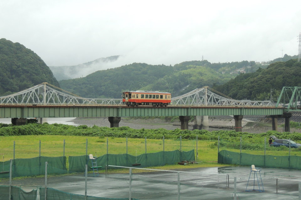 | 天竜浜名湖鉄道(天浜線) キハ20色塗装列車 天竜川橋梁(西鹿島←二俣本町) 西鹿島~二俣本町間を流れる天竜川に架かる天竜川橋梁を渡って西鹿島駅方面(三ヶ日・新所原方面)へ行く、ラッピング列車「キハ20色塗装列車」(TH2102/列車番号329 天竜二俣 13:50始発→新所原 15:03着)です。 写真奥のほうには、天竜川に架かる国道362号のトラス橋「鹿島橋」(かじまばし/昭和12年架橋)が見えています。 この日は「ゆるキャン△ SEASON3」ラッピング列車のお披露目・運転開始の日となっていて、この後、約13分後に「ゆるキャン△ SEASON3」ラッピング列車(TH2109)の臨時列車が同じく西鹿島駅方面へ走行していきました。 「ゆるキャン△ SEASON3」ラッピング列車の運転開始(臨時列車)・一般見学の様子の詳細は、以下↓のページでレポートしています♪ ☆「今日の鉄道写真~天浜線にて「ゆるキャン△ SEASON3」ラッピング列車がお披露目、運転開始」のページはこちら☆ 2024年6月30日(日)[13:53]現在~天気は雨 |