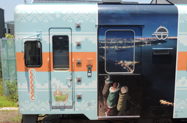 ゆるキャン△ ラッピング列車 (海側の側面 中央) (←写真左) TVアニメ「ゆるキャン△」のロゴマークが描かれています。 |