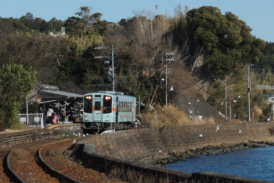 | 天竜浜名湖鉄道(天浜線) ゆるキャン△ ラッピング列車 尾奈駅 奥浜名湖駅方面(三ヶ日・天竜二俣方面)から尾奈駅に到着する、「ゆるキャン△」ラッピング列車(TH2109/列車番号331・天竜二俣 14:42発→尾奈 15:47→新所原 16:02着)です。 上の写真の右側のほうには、尾奈駅前にある、浜名湖特産品の「うなぎ(鰻)」の形が造形されたトイレも見えています。 ゆるキャン△ラッピング列車は、この日の翌日の2024年2月25日(日)にラストランとなることが発表されていました。 ☆当サイトの以下のリンク先で2月25日(日)の浜名湖佐久米駅でのラストランの様子をご紹介しています。 「今日の鉄道写真~天浜線『ゆるキャン△』ラッピング列車がラストラン、浜名湖佐久米駅ではグッズ販売も」のページはこちら♪ 2024年2月24日(土)[15:47]現在 ~天気は雲が見られるも晴れ(撮影時) |