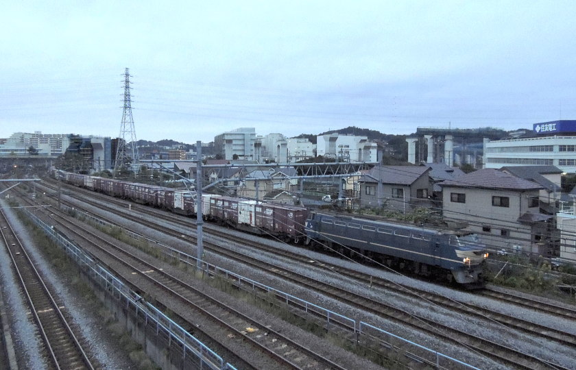 | 貨物列車 EH500-29+コキ(2079レ/戸塚→大船) 東海道貨物線(下り線)の戸塚~大船間を大船駅方面(平塚・相模貨物方面)へ行く、EH500-29+コキ(2079レ/EH500仙台 A165・新座貨物ターミナル→相模貨物)です。 2016年(平成28年)3月26日(土)に行われたJR貨物の貨物列車ダイヤ改正により、EH500牽引の貨物列車が日中において東海道貨物線の相模貨物駅まで乗り入れる定期運用が実施されるようになりました。 東海道貨物線乗り入れ当初は、戸塚駅周辺をおおむね14時50分前後に下っていたので、今年の春先にその時刻で待っていたところなかなか来ずに、別の日には15時過ぎに見かけることがあったので、あとで調べてみたところ、2020年3月14日の貨物列車ダイヤ改正により、戸塚駅周辺の通過時刻は15時10分前後に変更となっていました。 [2020(令和2年3月14日ダイヤ改正)/2079レ発着・通過予定時刻] 新座貨物ターミナル(12:56)→新鶴見信号場(13:43-13:46)→横浜羽沢(14:02-14:59)→相模貨物(15:33) 2020.10.23(Fri)[15:12]現在 |
