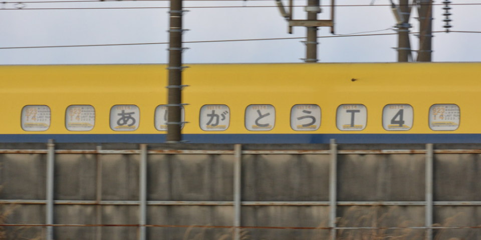 | ドクターイエロー(T4編成)の7号車の窓に掲げられた「ありがとうT4 LAST RUN」の表示 今回のT4編成の検測走行ラストランでは、なんと、博多方の先頭車1号車と東京方の先頭車7号車および中間車の4号車の窓に「ありがとうT4 LAST RUN」などの文字が掲示されていました。 写真は東京方先頭車の7号車に掲示された文字の様子で、下部のほうにはドクターイエローが描かれ、「SHINKANSEN Class 923 ありがとうT4」、「東海道新幹線 山陽新幹線 LAST RUN 2025.1」などと書かれていました。 写真は撮影していませんが、中間車の4号車の窓には、そのほか「JR東海 JR西日本 施設・電気検測員一同」などと書かれていたようです。 このような粋な計らいがJR東海によって公式に行われるとは予想もしていませんでしたので、ちょっとした嬉しいサプライズになったと思います。 と同時に、これまで東海道新幹線と山陽新幹線の安全運行を支えてきたこのT4編成と関係者の方々に感謝と敬意の念を感じます。 |