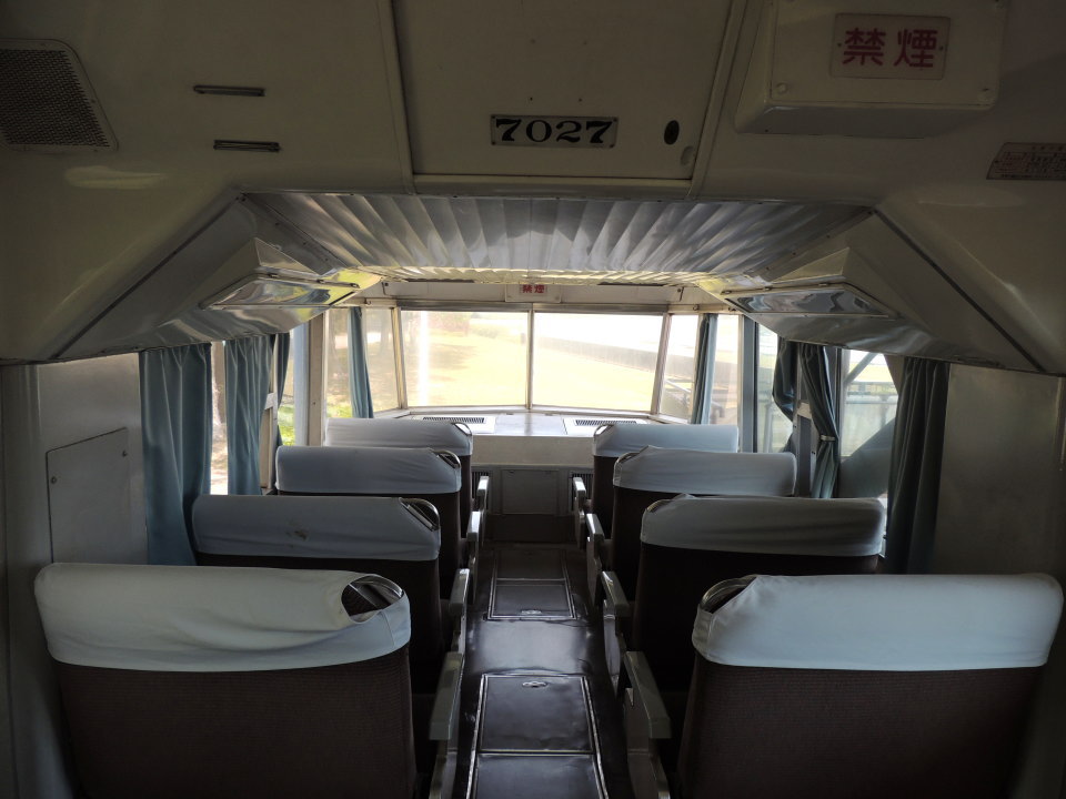 | 中京競馬場にて静態保存されている名鉄7000系の7027編成(3両/モ7028+モ7092+モ7027) 中京競馬場の場内の「パノラマステーション」にて静態保存されている、名鉄7000系パノラマカーの7027編成(3両/モ7028+モ7092+モ7027)です。 上の写真に写っている先頭車両がモ7028で、7027編成は2002年に廃車となり、同年8月から同編成のうち3両が中京競馬場の場内にて静態保存されているそうです。 私が訪れた時点では、上の写真の反対側の先頭車両「モ7027」には乗車することができ、先頭の座席にも座ることができました。(下の写真) 私自身は、7000系が一般車に格下げされて普通列車や急行の運用に入ってからも、7000系にはよく乗車する機会があっただけに、この車両が現役時代に、ひょっとしたら自分が乗車したことがあるのではないか、と思うと、とても感慨深いものがあります。 2025.04.27(日)現在 |