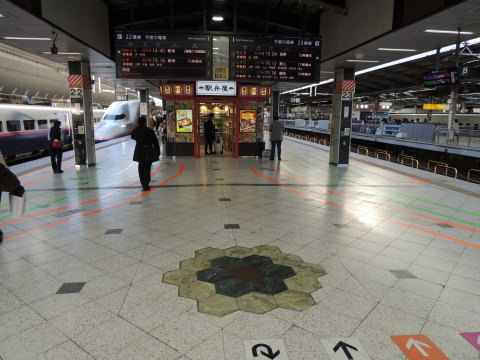 | 20・21番線島式ホーム上にある新幹線起点レリーフ 東京駅の東北・上越新幹線20・21番線島式ホーム中ほどのホーム床面には、新幹線の起点を示すレリーフが設置されています。 六角形を19個(1+6+12)用いた平面充填形(ハニカム)となっていて、中心部の六角形には「0Km POINT」(ゼロキロ ポイント)と表示されています。 このレリーフと同様のものが、東北・上越新幹線22・23番線島式ホーム上の床面にも設置されています。 2016.12.02現在 |