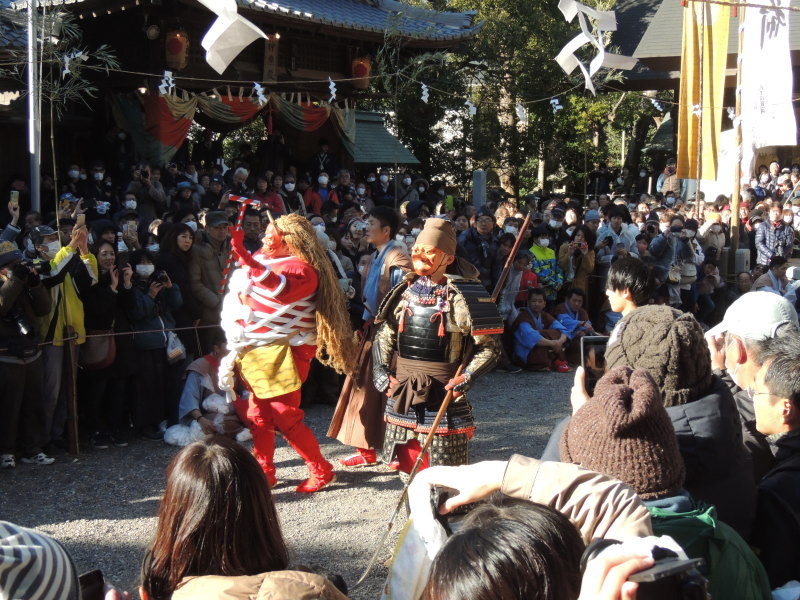 | 赤鬼と天狗のからかい 2020年2月11日(火・祝) 「豊橋鬼祭」(とよはしおにまつり)は、毎年2月10日・11日に豊橋市八町通にある安久美神戸神明社の春の例祭で行われる神事で、1000年以上の歴史を持つ伝統行事です。 神事のひとつである「赤鬼と天狗のからかい」が特に有名で、赤鬼が浄罪としてタンキリ飴の白い粉を撒き散らすことから「天下の奇祭」とも呼ばれています。 2020.02.11(Tue)現在 |