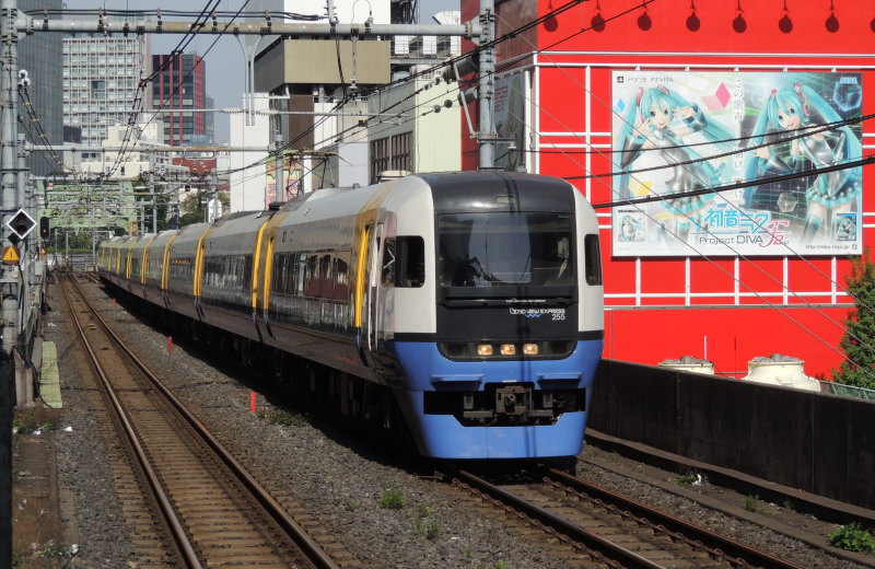 | 中央・総武線 255系 特急「新宿さざなみ1号」 御茶ノ水駅方面(新宿方面)から秋葉原駅に接近中の、255系(Be-01編成・BOSO VIEW EXPRESS)特急「新宿さざなみ1号」(9041M)です。 秋葉原駅の5番線ホーム西端(御茶ノ水・新宿寄り)にて撮影したもので、この特急「新宿さざなみ1号」の経路は、新宿(07:50始発)→秋葉原→錦糸町→船橋→津田沼→千葉→蘇我→五井→木更津→君津→佐貫町→浜金谷→保田→岩井→富浦→館山(10:01着)となっています。 なお、この写真の撮影時の「SEGA(セガ) 秋葉原 1号館」の壁面看板(写真右側)は、「PS3」及び「PS VITA」用リズムアクションゲームソフトの「初音ミク -Project DIVA- F 2nd」となっていました。 2014.05.03現在 |
