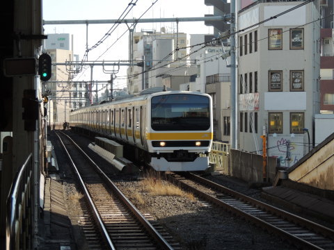 | 中央・総武線 E231系0番台(西行) 亀戸駅方面(船橋・千葉方面)から錦糸町駅(1番線)に接近中の、E231系0番台「各駅停車 中野」行(1017B・津田沼始発)です。 錦糸町駅の1番線ホーム東端側(亀戸・千葉寄り)にて撮影。 2015.01.17現在 |