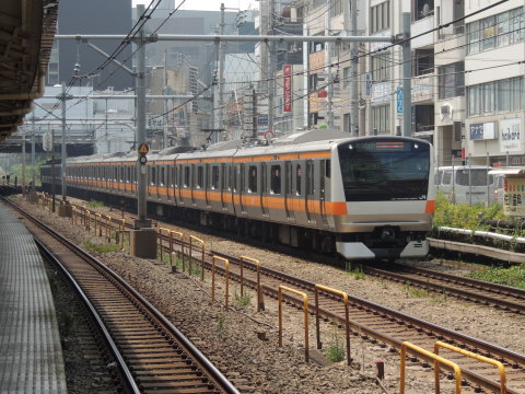 中央本線 E233系0番台(下り) 中央本線(急行線)の御茶ノ水~四ツ谷間を四ツ谷駅方面(新宿・中野方面)へ行く、E233系0番台(H55編成)「中央特快 高尾」行(1341T・東京始発)です。 中央・総武線(緩行線)の水道橋駅2番線ホーム東端側(御茶ノ水・東京寄り)にて撮影したもので、写真左側に見える2本の線路が中央・総武線(緩行線)になります。 2015.08.15現在 |