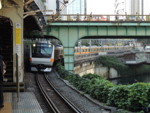 | 中央本線 E233系0番台(上り) 四ツ谷駅方面(新宿・中野方面)から御茶ノ水駅(4番線)に接近中の、E233系0番台(T25編成)「中央特快 東京」行(1224T・高尾始発)です。 御茶ノ水駅の4番線ホーム西端側(四ツ谷・新宿寄り)にて撮影。 なお、写真奥上方に見える橋は御茶ノ水駅の西側に架かる「お茶の水橋」で、写真右下には御茶ノ水駅の北側を流れる「神田川」が見えています。 2014.10.18現在 |