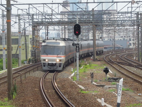 | JR東海 特急「(ワイドビュー)ひだ」 キハ85系気動車 名古屋~枇杷島間を岐阜方面(富山方面)へ行く4両編成の特急「(ワイドビュー)ひだ」キハ85系気動車(非貫通型先頭車)です。 名鉄栄生駅のホームから撮影したもので、写真奥側が名古屋駅方面で、名古屋駅ビルの「JRセントラルタワーズ」、「名古屋ルーセントタワー」、「モード学園スパイラルタワーズ」などの名古屋駅前を象徴するビル群が見えます。 キハ85系気動車は、JR東海が保有するキハ80系の置き換えおよび所要時間短縮のために開発され、1989年(平成元年)から製造されたそうです。 JR東海が運行する特急列車に掲げる「ワイドビュー」を最初に冠した車両になるそうで、1989年(平成元年)2月から高山本線の特急「ひだ」に使用され、1992年(平成4年)からは紀勢本線の特急「南紀」にも使用されているようです。 また、1989年の通商産業省グッドデザイン商品(現・日本産業デザイン振興会グッドデザイン賞)に選定されたそうです。 2012.07.24現在 |
