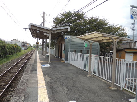 | 茶臼山駅 現在の駅舎は、1996年(平成8年)に改築されたものだそうで、それ以前は木造駅舎だったそうですが、1971年(昭和46年)の無人駅化以降に老朽化がすすみ1995年(平成7年)11月に解体されたそうです。 駅舎正面左側にある入口の階段を上がって行くとホームに出ます。 2012.08.26現在 |