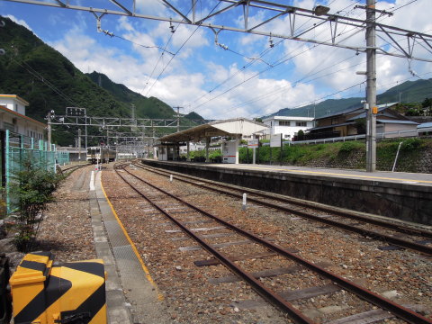 | ホーム北端側から見る佐久間駅方面(天竜峡・飯田方面)の様子 島式ホームに接する本線と側線が、ホームの先の佐久間方の分岐器でつながっている様子がわかります。 ホーム反対側の下川合方面(本長篠・豊橋方面)の本線からは、当駅構内の側線に入線できる分岐器は無いようですので、側線に入線する場合は、いったん佐久間駅方まで進行する必要があるようです。 |