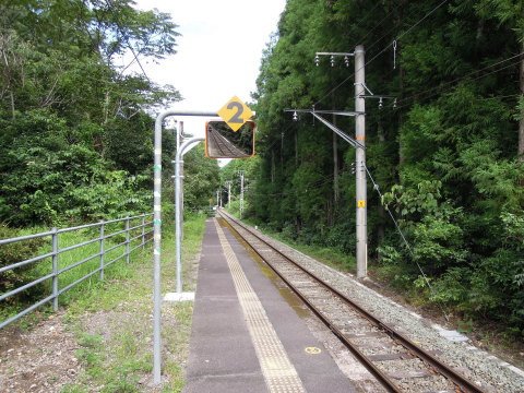 | 柿平駅 柿平駅の駅名標がある場所の、ややホーム出入口寄りのところから三河槙原駅方面(本長篠・豊橋方面)を撮影したものです。 2012.09.02現在 |