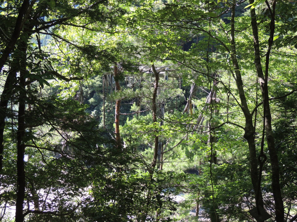 | 高瀬橋へ向かう途中で見える天竜川の水面と緑豊かな山々 さあ、行ってみよう! 高瀬橋へレッツゴー♪ 住居跡からほんの少し高瀬橋方面へ歩いただけで、そんな明るい気分になれる風景がいきなり現れます。 小道は綺麗に整備され、ガードパイプも設置されていて、天竜川と緑の山々、青い空が折り合う美しい風景を目にすることができます。 高瀬橋は、写真左奥のほうの三方の山が低くなっている場所辺りにあります。 写真をよく見ていただきますと、電線のようなものが小道沿いと、天竜川の両岸をつなぐように見えているのがわかります。 自分では何の線なのかはわかりませんが、このような人工物を目にすると、この場所が現代文明社会と全く無縁の完璧な秘境ではないことを感じてしまいます。 そして、うわあ、綺麗な景色だ♪ こんなに整備された小道なら高瀬橋まで気持ちよく歩いて行けるだろう、と思ったのも束の間、写真奥のほうに歩いていくと、上り坂がしばらく続くようになり、途中に「クマ注意!」の注意書きがあり、高瀬橋方面と塩沢集落方面の道が分岐した先は、倒木や小さな崖崩れ痕もありましたので、油断ならない道が高瀬橋まで続くことになります。 |
