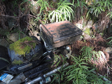 スズキ K125の後部に取り付けられたリアボックス このリアボックスを見ると小型で、あまり多くの荷物を積めるわけではなく、ひょっとしたら、この「スズキ K125」に乗っていた人は、この地から別の場所へ日々通勤するためにこのバイクを使用していたのではないか、とも思いました。 いわゆるサラリーマンの方だったのかもしれません。 もちろん、この地で農林水産業や土木工事関連に携わる方のものだったかもしれません。 いずれにせよ、食料品や日用品などの買い物(買い出し)に使用するには、少しリアボックスが小さいのではないかなあ、と個人的には感じます。 なお、この「スズキ K125」がこの場所に放棄されているのは、この地に来たらたまたま土砂崩れや橋の崩落などにより道路が通行不可能になってしまってやむをえず放棄した、あるいは悪意の違法投棄の可能性も否定しきれません。 なお、ガソリンはタンクに残っているようでしたので、ガス欠のために放棄されたものではないと思われます。 |
