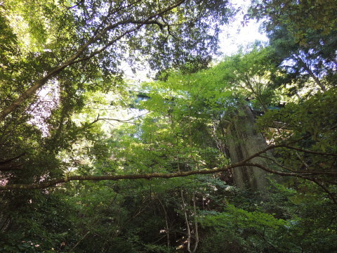 樹々の間に見えるメインケーブル 写真ではとてもわかりにくいですが、樹々の間には、今もピンと張り詰めているメインケーブルの姿を見ることができます。 |