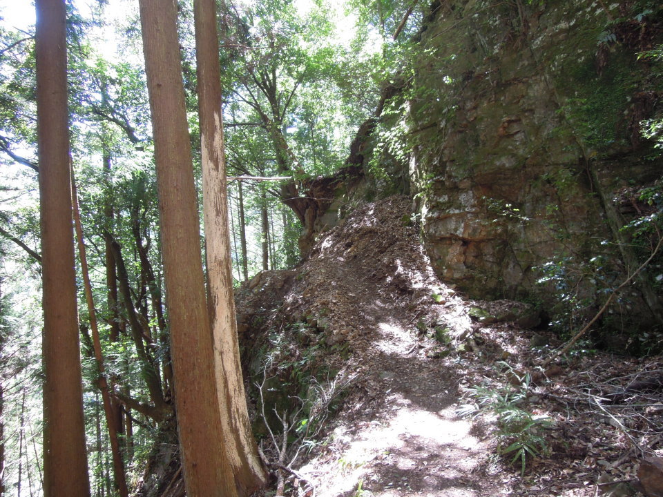 | 再び現れる倒木 高瀬橋までさすがにあともう少しだろう、と頑張って歩いていると、さらに倒木が現れます。 これらの倒木は、単に跨いでクリアすれば何の問題もないのですが、写真をご覧になってわかりますとおり、左手側は断崖となっていますので、倒木を跨ぐ時に侮って足を滑らせて崖下に滑落しないよう十分注意する必要があります。 目指す高瀬橋まで近づくにつれ、土砂崩れや倒木が増えるということは、この区間が人が使わない廃道となって長い年月が経っていることを間接的に証明しているのだろうと思います。 |