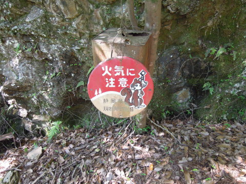 道中にあった纏を持ったリスが描かれた「火気注意」の看板 看板には「火気に注意 静岡県 天竜地域林野火災防止協」と書かれ、江戸時代の消防組織である「火消し」の旗印だった纏(まとい)を持ったリスが描かれていました。 なお、看板の後ろにある一斗缶(いっとかん/角形の金属缶)のようなものが、一体何の目的でこの場所にあるのかがわかりませんでした。 雨水を貯めておいて、いざという時の消火に使うためのものなのでしょうか? |