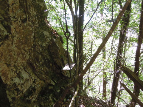 | 高瀬橋のメインケーブルのアンカーレイジ側 メインケーブルは、高瀬橋の手前側にある岩壁のほうにつながっていました。 メインケーブルをつなぎ止めて固定するアンカーレイジがコンクリート製のものなのか、自然の岩盤を利用していたのかは、さすがに岩壁を登る危険を冒してまでは確認できていません。 |