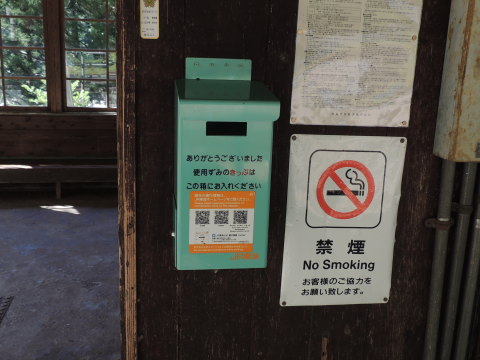 駅舎入口横に置いてあった杖 「NPO法人 山に生きる会」の方達の善意により、自由に使用していいように置かれていたようです。 木製のボックスには「使ったら元に返してください」と書いてありました。 |