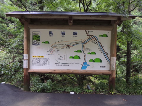 駐車場の「乳岩峡」案内看板 駐車場の案内看板には、「乳岩」までの距離と所要時間などが掲示されていますので、「乳岩」を目指す前に一度見ておくとよいと思います。 2016.09.13現在 |