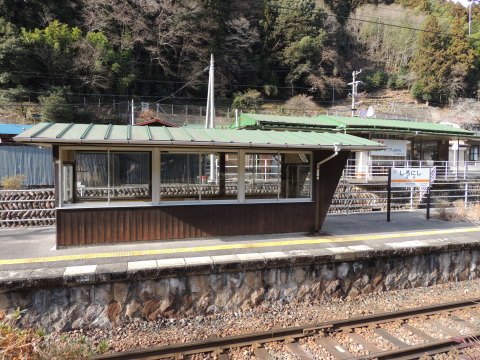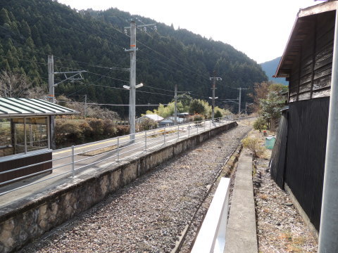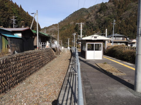 | ホーム上の待合室 ホーム上の待合室がある場所あたりから向市場駅方面(水窪・飯田方面)を撮影したものです。 写真左奥側に駅舎が見えています。 2013.01.05現在 |