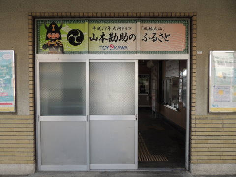 | 牛久保駅 駅舎の中をホーム側から撮影したものです。 駅舎の出入口の上には「山本勘助のふるさと」とあります。 2012.09.02現在 |