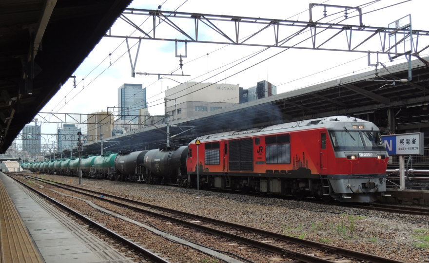 | DF200-201(Ai-Me/アイミー)+タキ 5282レ 名古屋駅 稲沢線 名古屋駅の在来線(関西本線)13番線と東海道新幹線14番線の間を通る貨物線の稲沢線(単線)を走行して名古屋駅を通過し、枇杷島駅方面(清洲・稲沢方面)へ行く、DF200-201[愛知]+タキ(5282レ[DF200愛知 A1]・塩浜→稲沢)です。 名古屋駅の関西本線13番ホーム北端寄り(枇杷島・稲沢寄り)にて撮影したもので、写真左奥のほうには名古屋臨海高速鉄道「あおなみ線」の名古屋駅のホームが小さく見え、写真右側奥のほうには東海道新幹線の名古屋駅のホームが見えています。 なお、愛知機関区所属のDF200形200番台のトップナンバーとなっているDF200-201号機は、愛知県と三重県を連想させる風景がイメージ、デザインされたラッピングが施され、一般公募により決定された愛称「Ai-Me」(アイミー)と名付けられて2023年1月16日(月)にお披露目式が行われ、同年1月23日(月)の2085レ(稲沢→四日市)から貨物列車牽引の運用に充当されています。 2023.07.03(Mon)[12:50]現在 天気は曇り |