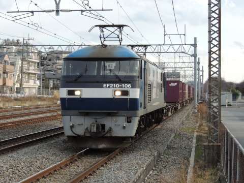 | EF210-107+コキ 東海道本線の豊橋駅方面(岡崎・名古屋方面)から二川駅に接近中の「EF210-107」+コキです。 二川駅の2番線ホーム西端(豊橋寄り)にて撮影。 2014.01.13現在 |