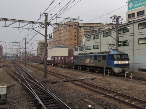 | EF210-4 東海道貨物線の辻堂~藤沢間を藤沢駅方面(横浜羽沢方面)へ行く「EF210-4」です。 藤沢駅の西方約1kmのところにある「鵠沼道踏切」にて撮影。 2013.03.02現在 |