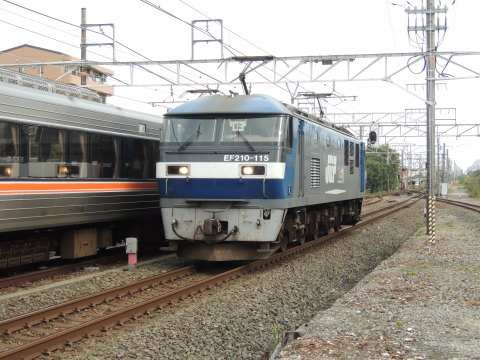 EF210-115(単機・5073レ) 二川駅(下り) (←写真左) 新所原駅方面(浜松・静岡方面)から二川駅に接近中(2番線通過)の、EF210-115(単機・5073レ[EF66吹田 A36B]・静岡貨物→幡生操車場※日曜稲沢止単機)です。 二川駅の2番ホーム東端側(新所原・浜松寄り)にて撮影したもので、写真左側には、二川駅の中線に停車中の373系(F12編成・3両編成)の回送列車(新所原・浜松方面行)が見えています。 2015.11.01(Sun)[13:06]現在 |