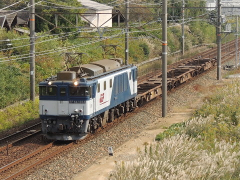 EF64-1004+コキ(9863レ) 豊橋~二川(下り) 豊橋~二川間を豊橋駅方面(岡崎・名古屋方面)へ行く、EF64-1004+コキ3B(9863レ[EF64愛知 B9863]・西浜松→稲沢)です。 国道1号の「新二川跨線橋」にて撮影。 なお、ここの撮影場所は、以前にも増して樹木が高く成長してきていますので、このままですと近いうちに樹木に視界を遮られ、東海道本線の列車を撮影できなくなる可能性がありますので、注意が必要です。 2017.11.04(Sat)[12:04]現在 |
