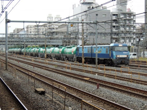 | 東川口駅(上り) EF210-142+タキ(5683レ) 南越谷駅方面(南流山・西船橋方面)から東川口駅に接近中(1番線通過)の、「EF210-142」+タキ(5683レ[EF210新鶴見 A233]・蘇我→宇都宮貨物ターミナル)です。 東川口駅の1・2番線島式ホーム東端側(南越谷・南流山寄り)にて撮影。 なお、写真左側に見える武蔵野線下り線を南越谷駅方面(越谷貨物ターミナル・南流山方面)へ行く貨物列車は、「EF65-2117」+コキ(75レ[EF65新鶴見 A63]・新鶴見信号場→隅田川)です。 2017.02.04(Sat)[12:28]現在 |