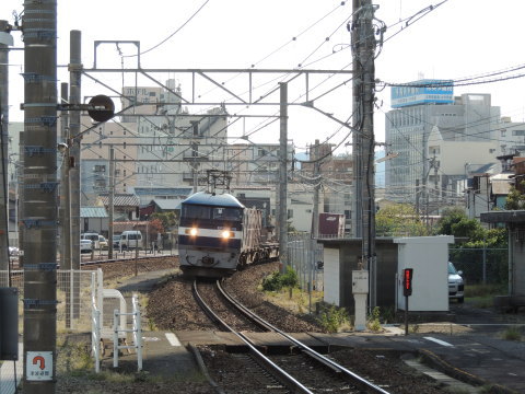 EF66-109+コキ(2079レ) 東静岡駅(下り) 東静岡~草薙間にある静岡貨物駅方面(草薙・清水方面)から東静岡駅に接近中(2番線通過)の、EF66-109+コキ(2079レ[EF66吹田 A31]・沼津→稲沢)です。 東静岡駅の2番ホーム北東端側(草薙・清水寄り)にて撮影したもので、写真右端側(南側)には「静岡県コンベンションアーツセンター(グランシップ)」の建物の一部が見えています。 2019.12.07(Sat)[15:14]現在 |