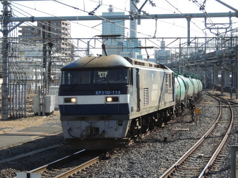 | 大宮駅(下り) EF210-114+タキ(3093レ) 大宮操車場方面(西浦和・府中本町方面)から大宮駅に接近中(10番線通過)の、「EF210-114」+タキ(3093レ[EF210吹田 A138]・根岸→倉賀野)です。 大宮駅の11番ホーム南端側(浦和・赤羽寄り)にて撮影したもので、写真右上奥のほうには東北・上越新幹線の高架線が見えています。 2016.12.24(Sat)[12:08]現在 |