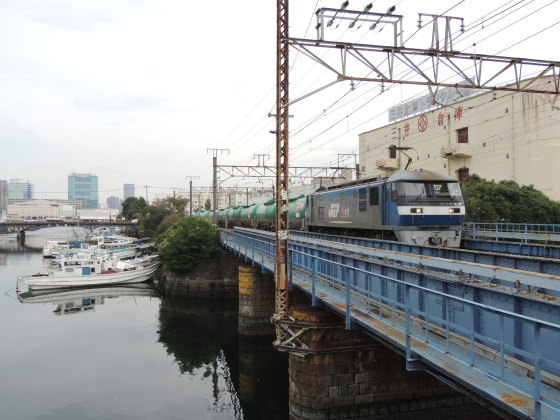 | EH200-11+タキ(85レ)海岸通踏切(上り・鶴見方面行) 高島線(貨物線)の東高島~鶴見間を鶴見駅方面(新鶴見信号場・府中本町方面)へ行く、「EH200-11」+タキ(85レ[EH200高崎 A205]・根岸→八王子)です。 京急本線の子安駅の南東約500mあたり(直線距離)のところにある「海岸通踏切」にて撮影。 2016.10.29[11:33]現在 |
