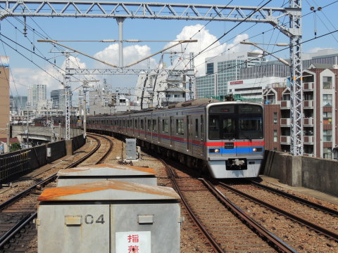 | 京成電鉄 3400形(上り) 鮫洲駅方面(京急蒲田・羽田空港国内線ターミナル方面)から青物横丁駅(2番線)に接近中の、京成電鉄「3400形」(3438編成・8両編成)「エアポート急行 泉岳寺」行(767K・羽田空港国内線ターミナル始発)です。 青物横丁駅の1番ホーム南端側(鮫洲・横浜寄り)にて撮影したもので、写真右奥のほうには、当駅から約500m南方にある鮫洲駅(KK05)が見えています。 2016.07.30現在 |