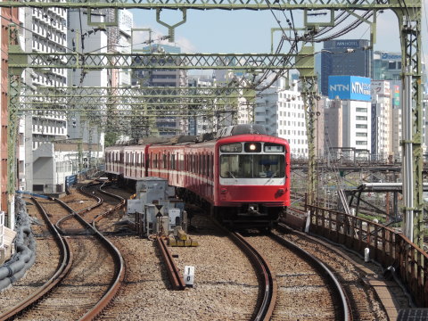 | 京急 1000形(上り)「特急 品川」行+「特急 成田空港」行 新馬場駅方面(京急蒲田・横浜方面)から北品川駅に接近中(2番線通過)の、1000形(1441編成・アルミ車・5次車)「特急 品川」行(金沢文庫にて増結)+1000形(1137編成・ステンレス車・10次車)「特急 成田空港」行(673H・三崎口始発)です。 北品川駅の2番ホーム南端側(新馬場・横浜寄り)にて撮影。 2016.07.30現在 |