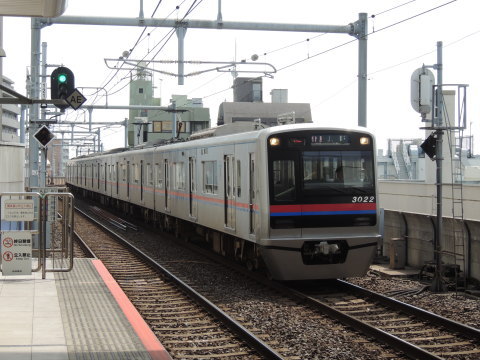 | 3000形(上り) 京成中山駅方面(京成津田沼・京成佐倉方面)から鬼越駅(1番線)に接近中の、3000形(3014F・6両編成・4次車)「普通 京成上野」行(京成臼井始発)です。 鬼越駅の1・2番線島式ホーム東端側(京成中山・京成津田沼寄り)にて撮影。 2018.05.12(Sat)現在 |