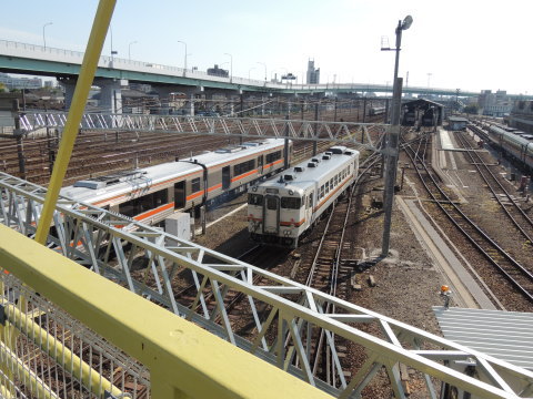 キハ40形5800番台(キハ40 5802) 「名古屋車両区」に回送されてきたこの「キハ40 5802」は、しばらく約20分ほど上の写真の場所に停車していましたが、その後、左の写真のように構内の南西側に移動していきました。 2013.04.25現在 |