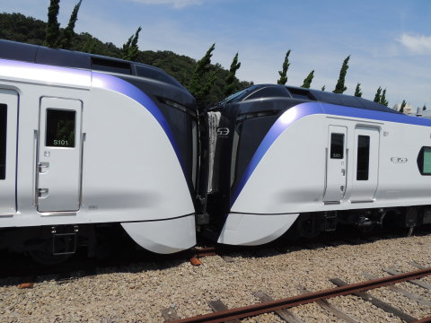 | E353系「S201編成」の様子 写真右側の3両編成が「S201編成」で、写真奥側から1号車「クモハE353-1」、2号車「モハE353-1001」、3号車「クモハE352-1」となっていたようです。 2015.07.25(Sat)[10:43]現在 |