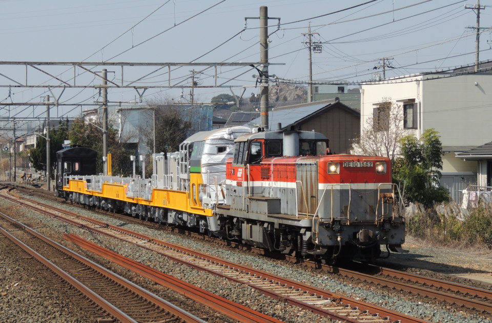 | DE10-1562+キヤE195系(ロンキヤ/LT-3編成・3両)+ヨ8404 2021年2月21日(日) 12時23分頃 二川駅 東海道本線(JR東海)の豊橋駅方面から二川駅に接近中(1番線通過)の、DE10-1562+キヤE195系(ロンキヤ/LT-3編成・3両)+ヨ8404の甲種輸送列車(9772レ・豊川→西浜松)です。 豊川から西浜松までの牽引機は、昨日の2月20日(土)に同じく豊川から西浜松まで甲種輸送されたキヤE195系(ロンキヤ/LT-3編成・8両)に引き続いて「DE10-1562」が充当されました。 この日は、昨日に甲種輸送されたキヤE195系「LT-3編成・8両」と、今回の同「LT-3編成・3両」が西浜松駅にて連結されて本来の11両編成に組成されて、EF65-2063の牽引により「LT-3編成・11両編成」は、西浜松から田端信号場まで甲種輸送されたようです。 田端信号場から所属先の尾久車両センターへはDE10-1571が牽引し、これにより尾久車両センター配置のキヤE195系は、定尺レール輸送車(25m/ST編成)が17編成、今回甲種輸送されたロンキヤ(ロングレール輸送車・150m/LT編成)が3編成となったようです。