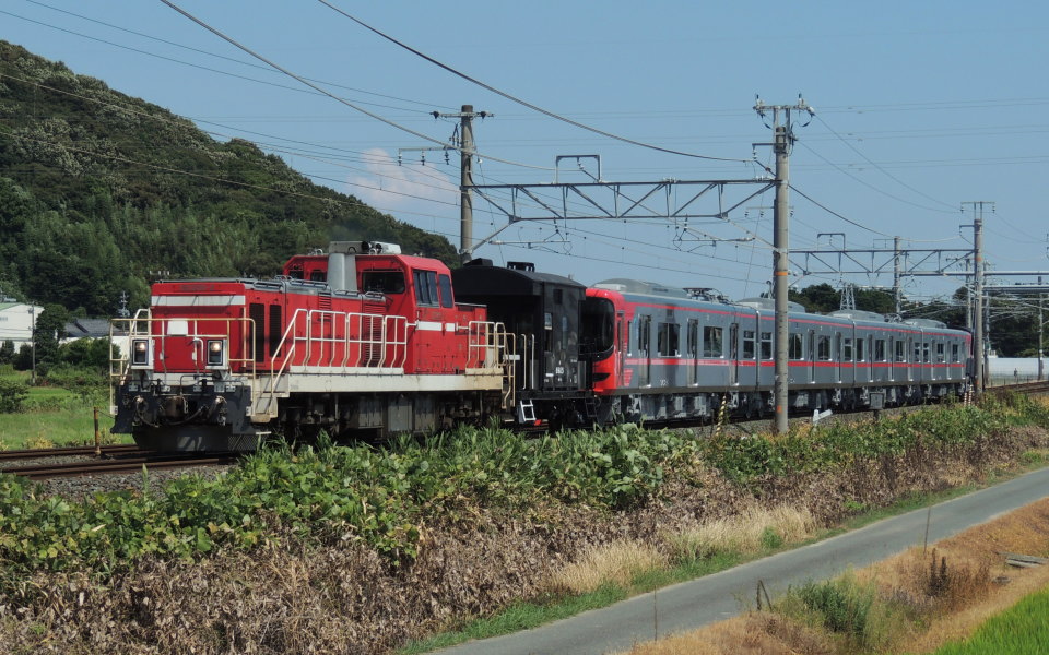 | DD200-5+ヨ8642+名鉄9500系(9515F)+9100系(9108F)+ヨ8632 愛知御津←西小坂井 西小坂井駅(JR東海)の東海道本線下り線3番線を通過して愛知御津駅方面(岡崎・刈谷方面)へ行く、DD200-5[愛知]+ヨ8642+名鉄9500系(9515F/4両編成)+9100系(9108F/2両編成)+ヨ8632の甲種輸送列車(9777レ 豊橋→笠寺)です。 この日の名鉄9515Fと9108Fの甲種輸送は、ここ最近の日本車輌製造豊川製作所から出場する甲種輸送のように水曜日に出場するのではなく、月曜日に出場するという近年では珍しいケースとなりました。 2023.07.31(Mon)[13:16]現在~天気は雲が広がる晴れ |