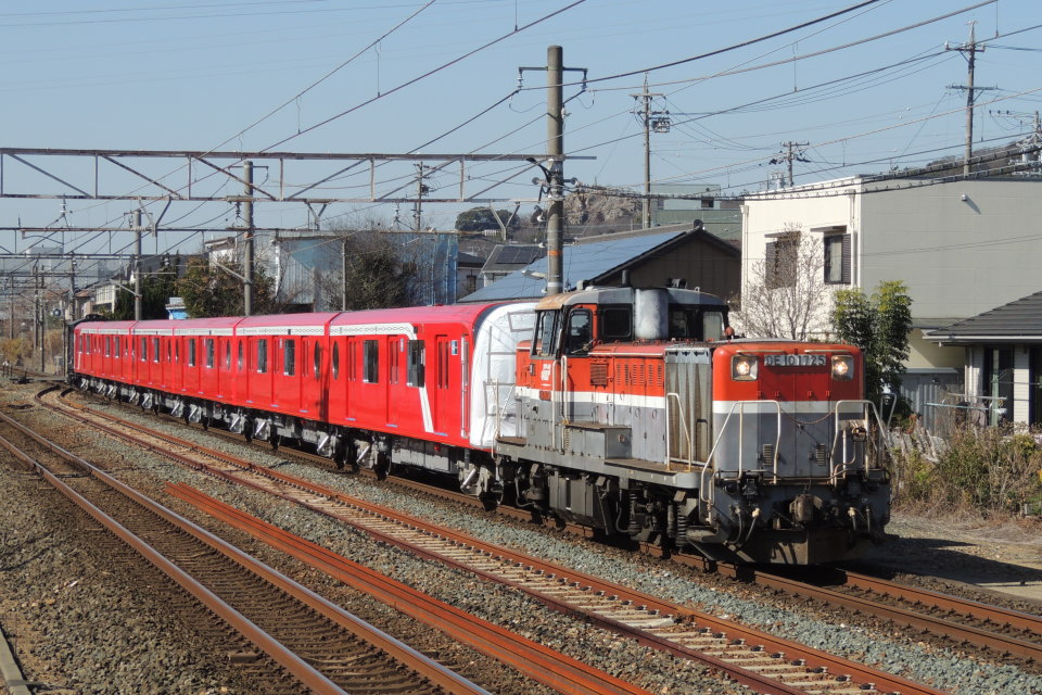 | DE10-1725+東京メトロ丸ノ内線 2000系(2131F)+ヨ8625 2021年2月6日(土) 12時24分頃 二川駅 東海道本線(JR東海)の豊橋駅方面から二川駅に接近中(1番線通過)の、DE10-1725+東京メトロ丸ノ内線 2000系(2131編成・6両)+ヨ8625の甲種輸送列車(9772レ・豊川→豊橋→西浜松)です。 今回甲種輸送されたのは、日本車輌製造豊川製作所(愛知県豊川市)にて新造された、東京メトロ(東京地下鉄)の丸ノ内線用の通勤形電車2000系「2131編成」(第31編成・6両)で、2021年2月6日(土)から2月7日(日)にかけて豊川(愛知県)から根岸まで甲種輸送されました。 牽引機は、豊川→西浜松がDE10-1725(愛知機関区所属)、西浜松→横浜羽沢が広島更新色でカラシ色の貫通扉が特徴的なことで知られるEF65-2127(新鶴見機関区所属)、横浜羽沢→新鶴見信号場がEF65-2083(新鶴見機関区所属)、新鶴見信号場→根岸がEF210-173(新鶴見機関区所属)となっていたようです。