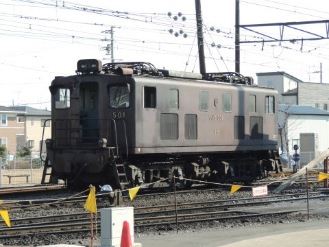 | ED500形「ED501」 新金谷駅に併設されている「新金谷車両区」に留置されていた、ED500形電気機関車「ED501」です。 このED500形は、元はかつて「大阪窯業セメント」(「大阪セメント」を経て現在の「住友大阪セメント」)が伊吹工場専用線で使用していた「いぶき500形」直流用電気機関車で、同専用線廃止後に大井川鉄道に譲渡されたものなのだそうです。 大阪窯業セメント「いぶき500形」電気機関車は、1956年に日立製作所で2両が製造され、形式名の「いぶき」は、大阪セメント伊吹工場専用線の名の由来になった伊吹山から取られたものなのだそうです。 同線のセメント輸送が、1999年6月末限りでトラックに切り替えられ廃線となったため、大井川鉄道に譲渡され、ED500形「ED501・502」として2000年2月22日に竣工し、3月18日から運転が開始されたそうです。 なお、車体側面中央部には「いぶき 501」の文字表示がそのまま残っています。 (※詳細「Wikipedia」、「大井川鉄道」公式サイト~「車両紹介」参照) 2013.12.31現在 |