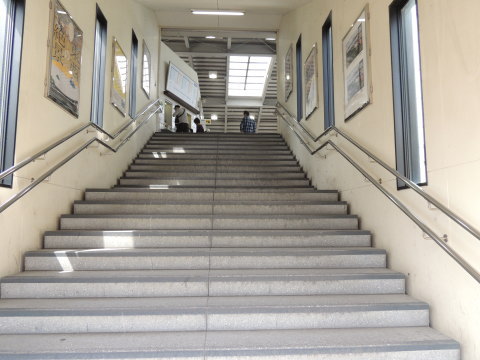 | 狐ヶ崎駅の橋上駅舎へ上がる階段 狐ヶ崎駅は橋上駅舎となっているため、改札口及びホームへ向かうためには、写真の階段かエレベーターを使用することになります。 2016.04.09(Sat)現在 |