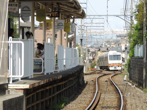 北東側から見た御門台駅の様子 上の写真は、御門台駅を当駅の北東約50mあたりのところにある「七ツ新屋第3踏切」から撮影したもので、写真奥方向(南西方向)が草薙駅方面(新静岡方面)、手前方向(北東方向)が狐ヶ崎駅方面(桜橋・新清水方面)になります。 御門台駅の島式ホーム1面2線の様子がわかります。 2016.04.09(Sat)現在 |