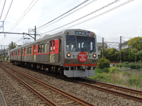 | 静岡鉄道 1000形(1002編成) 入江岡~新清水間を終点の新清水駅方面へ行く、1000形(1002編成・2両編成)「普通 新清水」行です。 入江岡駅の東方約250mあたりのところにある「浜田踏切」付近にて撮影したもので、写真右奥のほうには、静岡鉄道静岡清水線の北側を走行する東海道本線(JR東海)の架線類が見えています。 この「1002編成」の車両前面には、「静岡県立美術館 30th」と書かれた円形のヘッドマークが掲示され、車体側面には「風景とロダンの静岡県立美術館 開館30周年」のラッピングが施されていました。 ・1000形「1002編成」 1973年(昭和48年)竣工 クモハ1002(新静岡方)+クハ1502(新清水方) 2016.04.09(Sat)現在 |